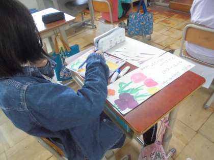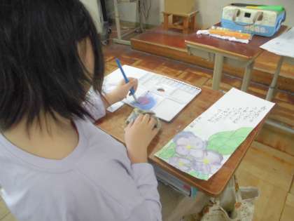図画工作「自然を感じて」では、校内に咲く植物を描きました。水彩絵の具のよさを生かして色を塗りました。
