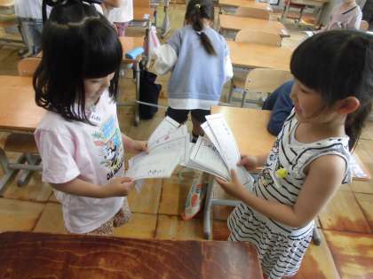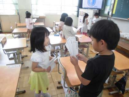 自分の名前を書いたカードを、お友達と交換しました。