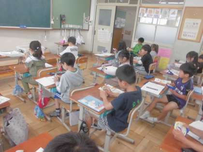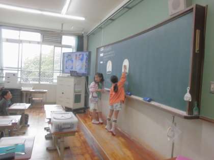 時計を使いながら、長い針が1周回ったら1時間になるということを確認しました。