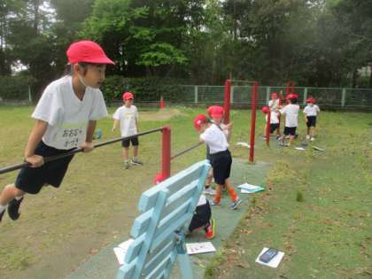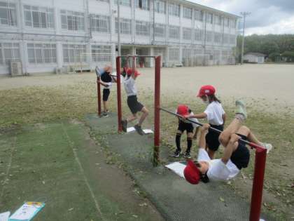 体育の学習で鉄棒運動をしています。上る技・回る技・下りる技の中から自分ができる技、できそうな技を挑戦しています。それ以外にも連続技なども練習しています。手に豆を作り名が頑張っている人もいます。