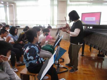 音楽では、リズム打ちをしていました。拍に合わせて、手をたたいたり、足で音を出したりしていました。少し速くなると、難しそうでした。今日は、「朧月夜」の新しい歌にも取り組みました。