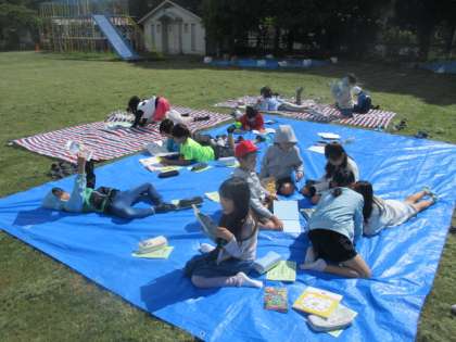 今年度初めての「青空読書」をしました。天気は良かったのですが、風が冷たく少し寒い日でした。芝生の上で寝ころびながら読んだりバスの中で読んだり、みんな友だちと楽しそうに読んでいました。