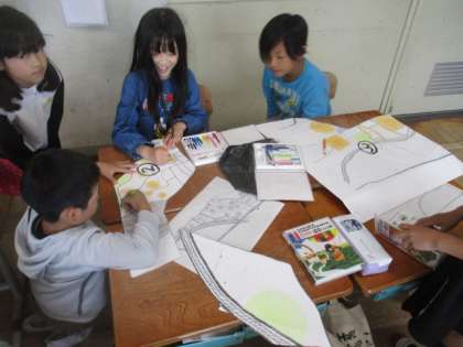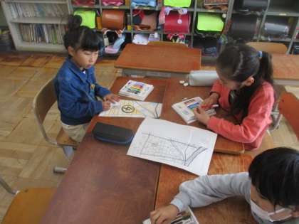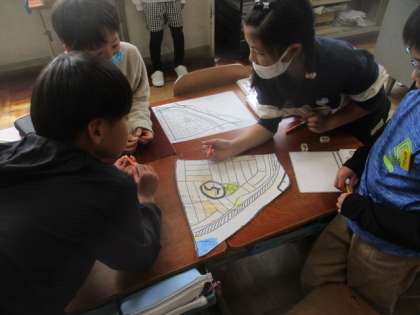 ゴールデンウイークの期間にそれぞれが調べてきた家の近くの地図をひとつの大きな校区地図を作ります。どこに何があるのかが見てすぐにわかるように、色を塗りました。完成が楽しみです。