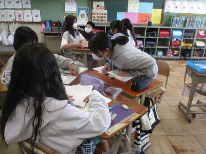 上里小学校の良いところについて、その場所と関わりのある方にインタビューするための準備をグループごとにしています。