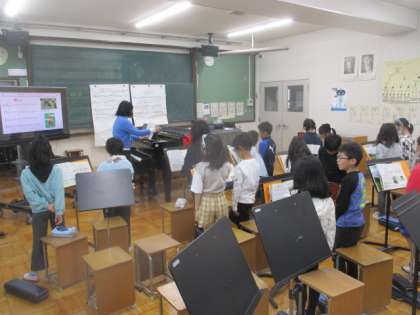 音楽の学習で「茶つみ」を初めて歌いました。曲の感じをとらえたり、歌詞の意味を考えたりして歌いました。