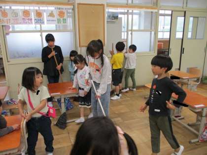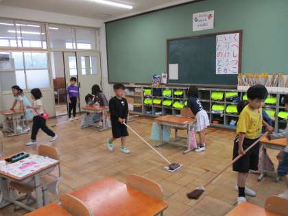 今日から掃除がはじまりました。はじめはほうきの持ち方も分からなかった子どもたちですが,6年生のお兄さん,お姉さんに教えてもらいながら,最後まで頑張ることができました。初めてで不安そうな子もいましたが,毎日頑張ってお掃除することの大切さや気持ちのよさを感じてもらいたいです。