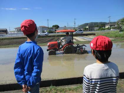 見学する中で「運転するのに免許はいるのかな?」「トラクターは高いのかな?」「トラクターがない時代はどうやって代かきをしていたのかな?」「お米を育てる際に出てくる害虫はどんなものがいるのかな?」など、たくさんの疑問が出てきました。