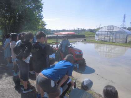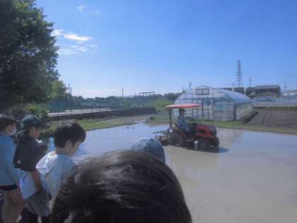 地域の方に協力をしてもらって代かき見学をしました。田の変わり方をしっかり観察したり、話をしっかりと聞いたりしたりしていました。次は、田植えをします。
