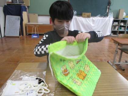 6年生が家庭科で作っている「ナップサック」が出来上がりました。ひもを通したり、名前やアップリケをアイロンでつけたりしました。「やったあ!やっとできた。」とても嬉しそうでした。このナップサックは、修学旅行にも持っていきます。とても楽しみです。