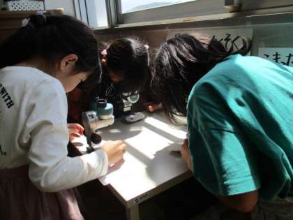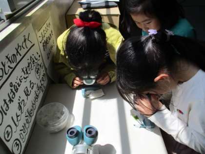 理科の学習で、モンシロチョウのキャベツの葉についた卵を観察しています。今日、見ていた子どもたちが幼虫を発見し、「生まれた!」と大騒ぎして喜んでいました。