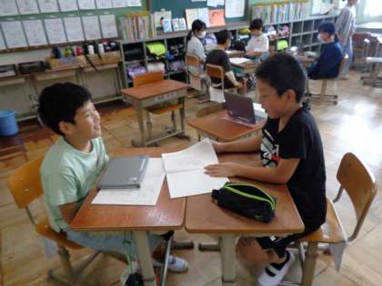 国語では、話し手、聞き手、記録者に分かれて、インタビューをする学習をしています。