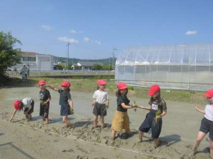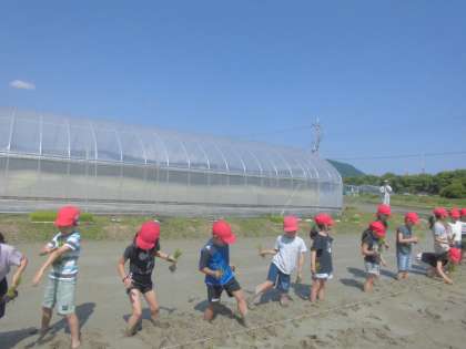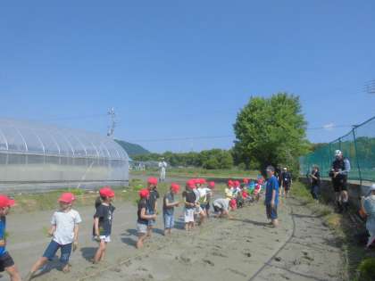 「ぬるぬるする!」「変な感じ。」と声をあげながら田植えをしました。