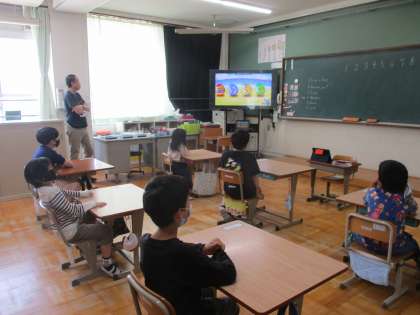 みんなで読み方を確認し、続けて算数の問題を英語で答える活動をしました。