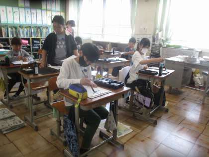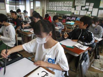 6年生初めての毛筆の時間。歩むという字にどのような思いをこめて書くか考えました。「一歩一歩歩む」「挑む気持ちで」などの思いをこめて、力強く書いてみました。
