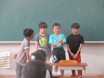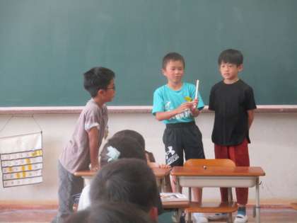 中間休みに「マジック係」がマジックをしてくれました。割りばしに書かれた印が動くというマジックでした。手品を見て、みんな驚いていました。