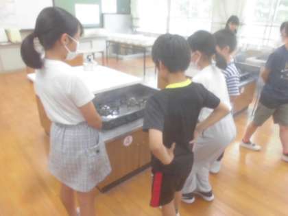 家庭科室の探検をして様々な用具を見つけました。その後に、お茶をいれました。班で協力して頑張りました。