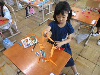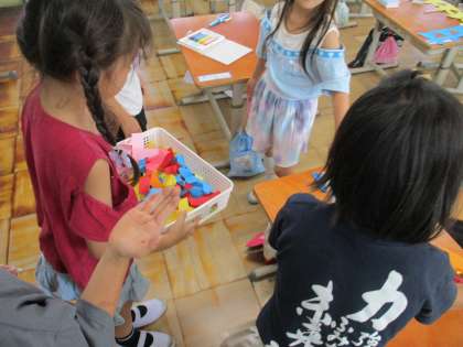 今日は,前回の図工に引き続き,色紙をハサミで切ってつながった形を作りました。人の形を作るのが楽しく,たくさん作って見せてくれる子どもたちがたくさんいました。みんなが作った飾りを模造紙に貼って1枚の作品に仕上げました。ハサミの使い方もだんだんと上手になっていき,複雑な形も挑戦することができました。また,落ちている折り紙を拾って綺麗にお掃除してくれる子もいました。