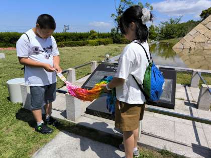 べっちゃない広場の慰霊碑にみんなで折った千羽鶴を奉納しました。