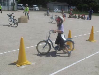 今日は2年生の自転車教室がありました。警察署の方からお話を聞いた後、一人一人順番に自転車に乗りました。3組の子どももうまく足を使いながら、ルールを守って安全に乗ることができました。