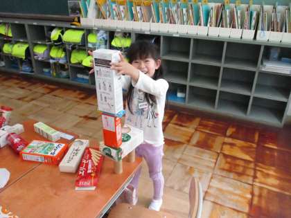 空き缶や空き箱を使って,いろいろなものを作ってみました。高く積み上げてキリンを作ってみたり,筒や箱を使って家を作る子も,自動車を作る児童もいました。自分なりに工夫し,試行錯誤しながら頑張っていました。