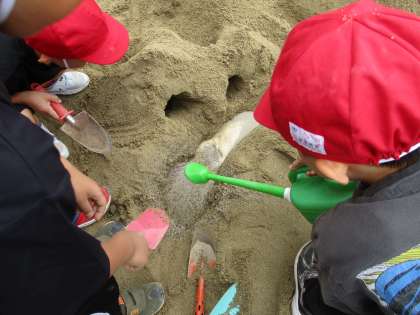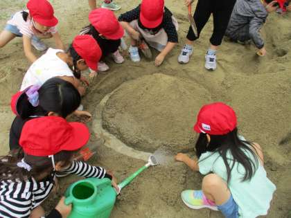 先週,天気が悪い日が続いたのですが,みんなの図工への熱意が伝わったのか奇跡的に天気が回復したので学校にある砂場で砂や土に触れてみました。熱心におやまを作ってみたり,トンネルを作ってそれに水を流したりとクラスのお友だちと協力する場面が見られました。