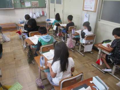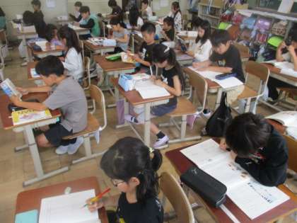 国語の学習「こまを楽しむ」では、いろいろなこまの楽しみ方を自分で読み取ってノートに書いていきます。みんな一生懸命教科書も見ながら書いていました。