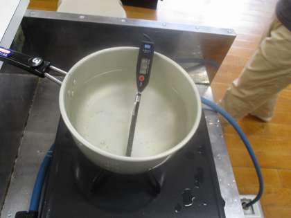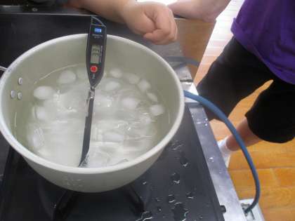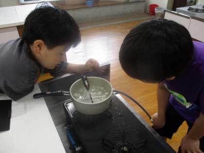 今日の理科では、水や氷水、お湯の温度を測りました。氷水に手を入れると「つめた〜い」温かいお湯に手を入れると「お風呂と一緒ぐらいかな」沸騰したお湯を見て「これは手を入れるとやけどするよ」など、いろいろ体験したことを話しながら温度を測定しました。