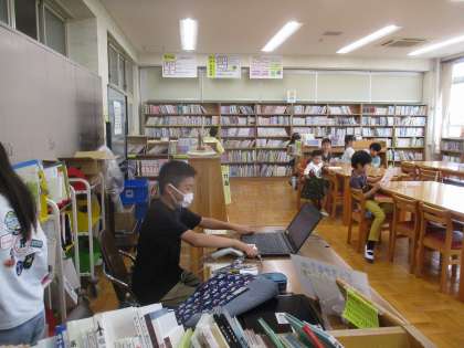 中間休みや昼休みに委員会の活動をしています。今日は、図書室をのぞくと、図書委員さんが本棚を点検したり、貸出・返却の処理をしたりしていました。