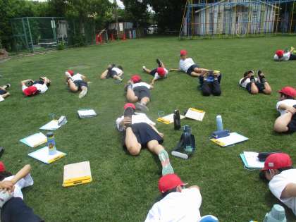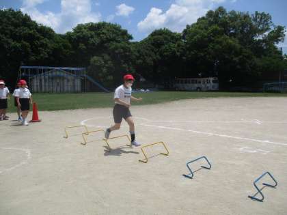 芝生の上でのストレッチはとても気持ちが良かったです。ミニハードルでもも上げの運動もしました。
