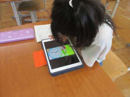タブレットを使って、時刻の読み方を何回も繰り返し行いました。