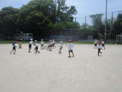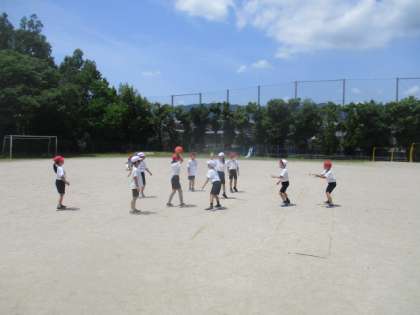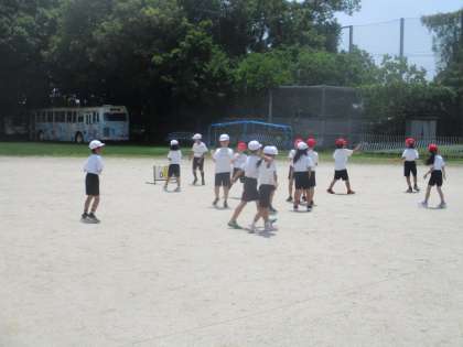 体育の学習で「エンドボール」をしています。チームでボールをつなげてゴールを目指します。みんな楽しそうに試合をしていました。