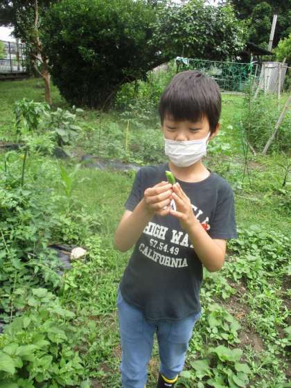 今日は雨があがった後、3組の畑へ行きました。いつものように観察してタブレットで写真を撮ってから、実っている野菜を収穫しました。「ピーマンが大きくなっているよ」「黄色いトマトだよ。おいしいかな」と声を掛け合いながら順番に収穫しました。