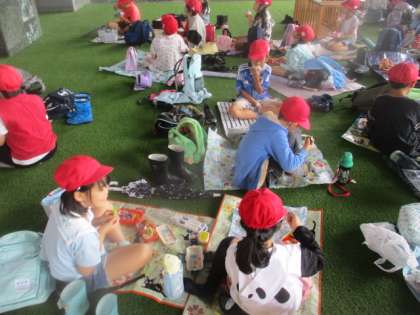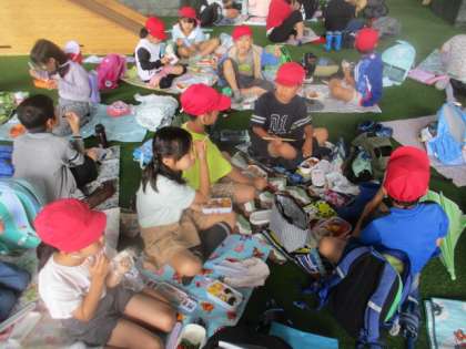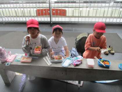 京都タワーを見学した後、雨天だったので京都駅ビルの南広場というところで弁当を食べました。みんなおいしそうに楽しく食べていました。