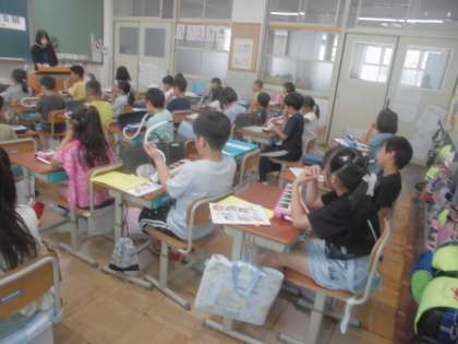 けんばんハーモニカを使って、かえるの歌の輪唱を練習しました。
