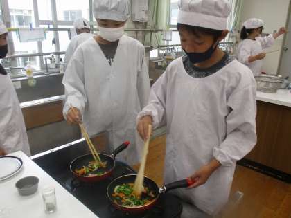 今日は1組の調理実習でした。ピーマン・にんじん・たまねぎ・ハムを切り、班で4人分に分けて、自分の分は自分で炒めました。短冊切りや千切りなども手際よくやっていました。