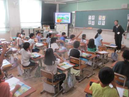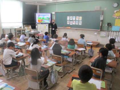 7月8日(月)にALTの先生にまた来ていただきました。子どもたちは、エマ先生に会えてとてもうれしそうでした。この日は、「I like blue.」という学習で、英語での色の言い方を学習しました。みんな積極的に発声していました。