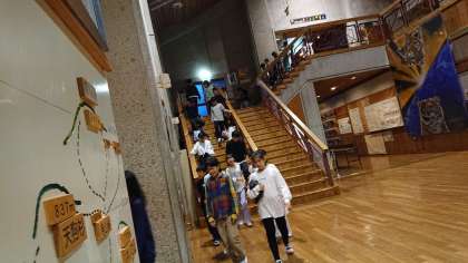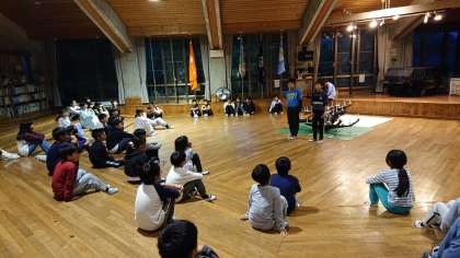 雨で足元が悪いため、予定を変更し、オリエンテーションホールでキャンドルファイヤーを行いました。