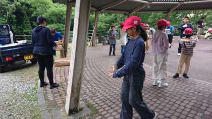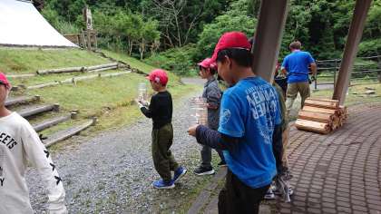 なんと!全部の班が火おこしに成功しました!!すごい!!ともった火は、消えないように置いておき、いよいよ野外炊事パート2の始まりです。今日は、カレーライスを作ります。前回はおかずのみの野外炊事でしたが、今回はごはんも飯盒でたきます。おいしくできるかな〜??