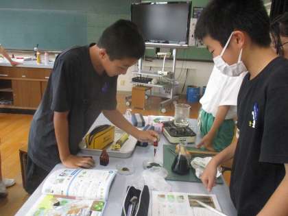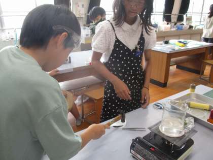 今日の実験では、日光にあたっている葉には、でんぷんができるのかを調べる実験をしていました。葉だけではわかりにくいことからろ紙をつかって実験していました。葉を煮た後、ろ紙に包み、とんかちでたたいて、ヨウ素液をかけていました。