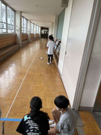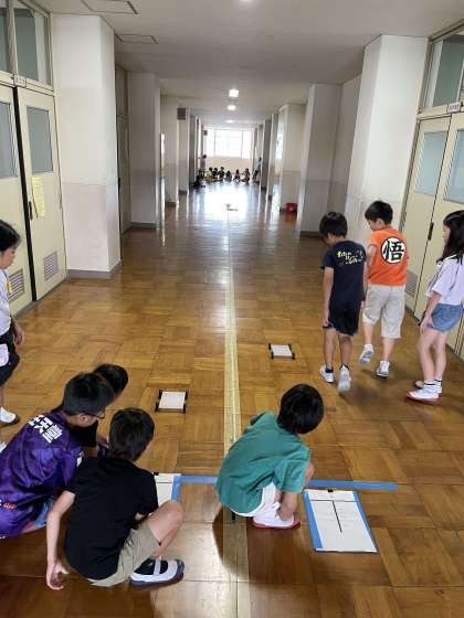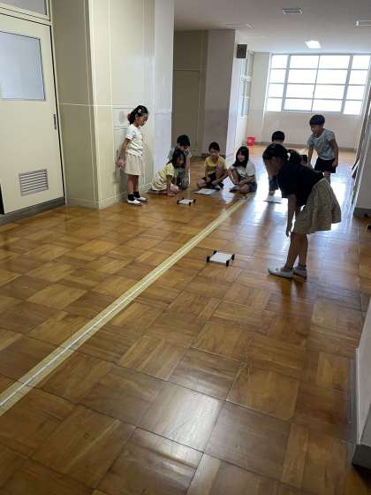 理科の学習で,ゴムをのばす長さをかえると,ものを動かすはたらきはどのようにかわるのかを調べました。