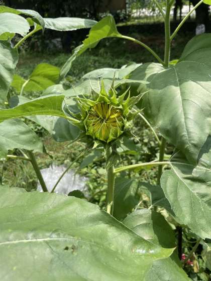 ヒマワリのつぼみがふくらんで,黄色い花びらが見えてきました。