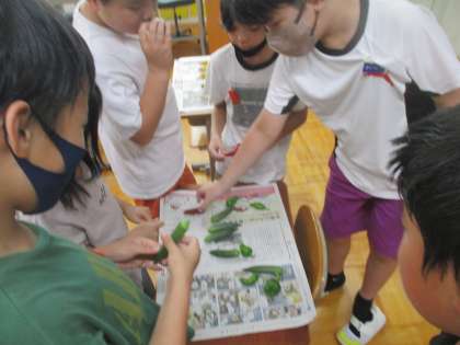 収穫した野菜たちの変容ぶりにびっくりする子ども達。