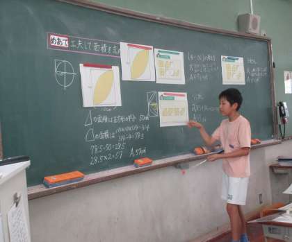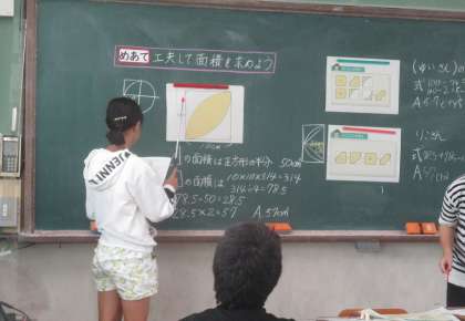 今日は楕円形の面積を既習の公式を使って工夫して求める学習をしていました。いろいろな考え方についてグループで話し合ったり、説明したりしていました。