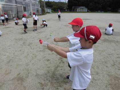 マヨネーズやソースの空き容器、ペットボトルなどを使って水遊びをしました。