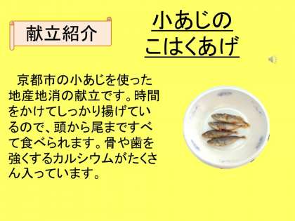 こあじの琥珀揚げは、新献立でした。こあじを丸ごとからっとあげてあるので、頭からしっぽまでまるごと食べられました。骨まで食べられるので、カルシウムがたくさんとれます。とても気に入った児童もいて、「家でつくってもらおう。」と話していました。