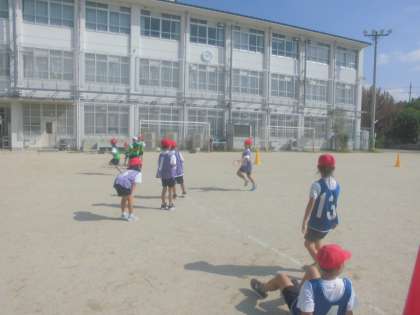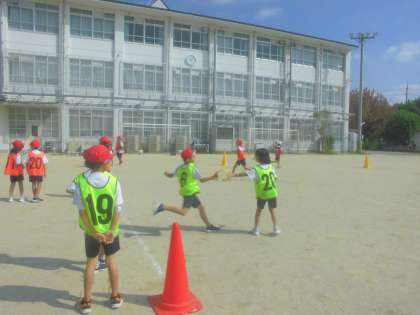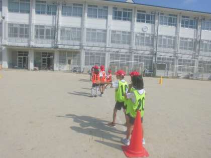 相手が渡しやすいように、またスピードが落ちないように工夫をしてバトンパスをすることができていました。