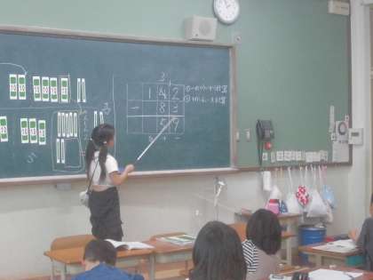 100は10のたばが10個、10は1の棒が10個集まった数であることを確かめながら、筆算の仕方を上手に説明することができました。