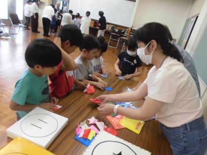 けん玉、あやとり、ゴムでっぽう、紙相撲、お手玉の5つのコーナーを順番に回りました。