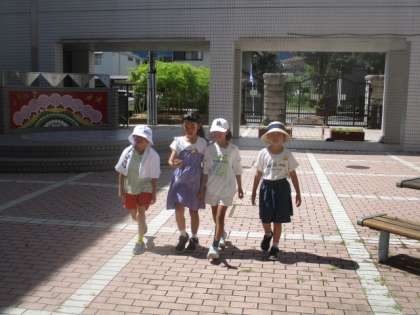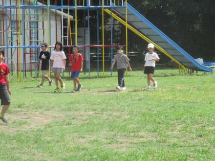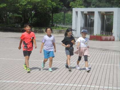 算数の長さの学習で、100mを歩くタイムを調べて、そのタイムをもとに何mあるかを調べる学習をしました。どのグループもみんなで協力をして、おおよその距離を調べることができました。