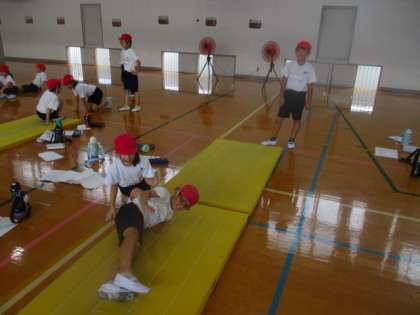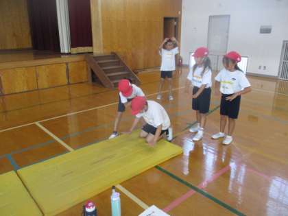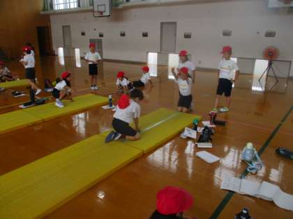 体育の「マット運動」では、前転・開脚前転・後転・開脚後転がみんなできるように、グループで教えたりアドバイスをしたりしながら頑張っています。そのおかげで、たくさんの人ができるようになりました。